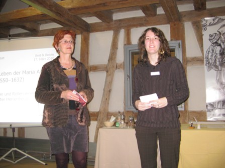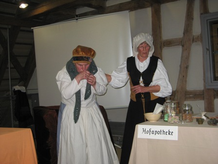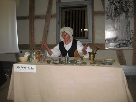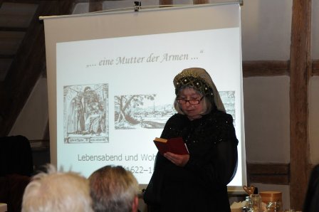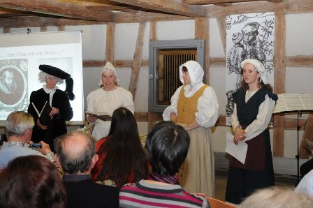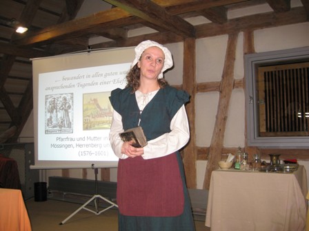 Mehrere Spielszenen ergänzten den Vortrag: Eine Nachbarin berichtete über Maria Andreäs Qualitäten als Eheberaterin. Maria Andreäs Tochter Anna sinnierte über das Verhältnis der Eheleute Maria und Johannes Andreä. In einer dritten Szene wurde der Alltag der Hofapothekerin Maria Andreä gezeigt.