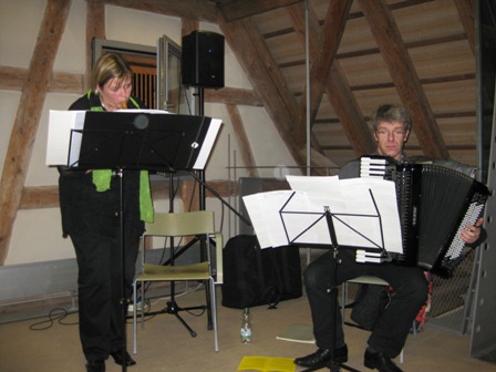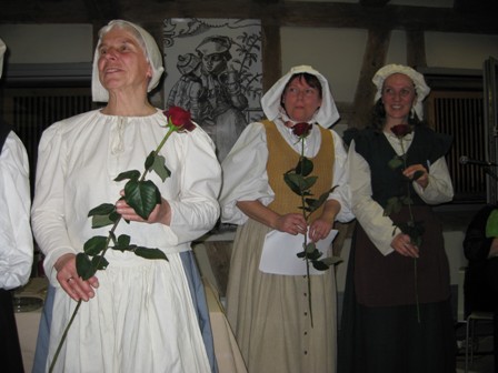 Auch musikalisch und kulinarisch wurde das Publikum ins 16. und 17. Jahrhundert zurückversetzt: Veronika Vogel-Müller (Sopranblockflöte) und Dieter Dörrenbächer (Akkordeon) spielten mehrere barocke Musikstücke. Bei Gewürzwein und Gebäck, hergestellt nach alten Rezepten, konnten die Zuschauerinnen und Zuschauer den Abend ausklingen lassen und mit den Frauen der FGW ins Gespräch kommen.