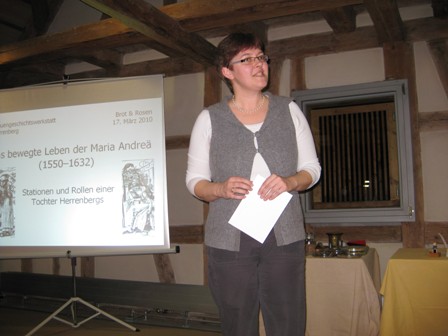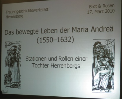 Am 17. März 2010 lud die Frauengeschichtswerkstatt (FGW) Herrenberg zu einem unterhaltsamen Abend auf den Spuren einer bemerkenswerten Frau in die Herrenberger Stadtbibliothek ein: Maria Moser, verheiratete Andreä, 1550 geboren als Tochter des Herrenberger Vogts, hatte ein reich erfülltes Leben. Als Pfarrfrau, Mutter, Hofapothekerin, Wohltäterin wirkte sie unter anderem in Herrenberg, Tübingen, Leonberg und Calw.